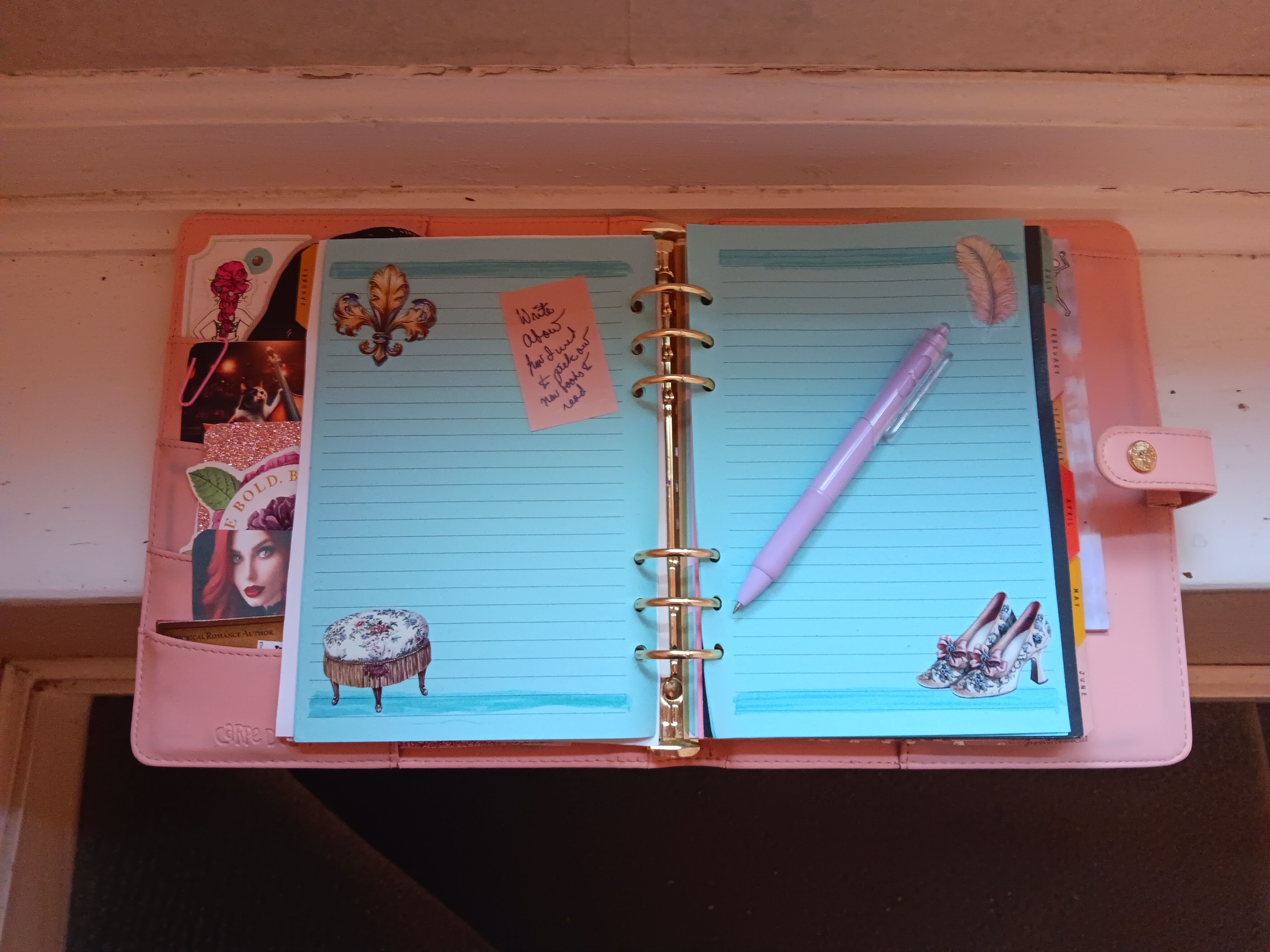 A couple of days ago, I came home from the hospital, not yet ready for bed. I set up January in a personal sized ring planner, with an undated refill that has lovely pale pink accents throughout. I like my own handwriting, so I don’t need date stickers. I’m pretty well stocked with deco stickers, washi, etc. I like to think of it as a wine cellar for stationery. Please note, I do not drink, so maybe I have the wrong idea of how to use a wine cellar.