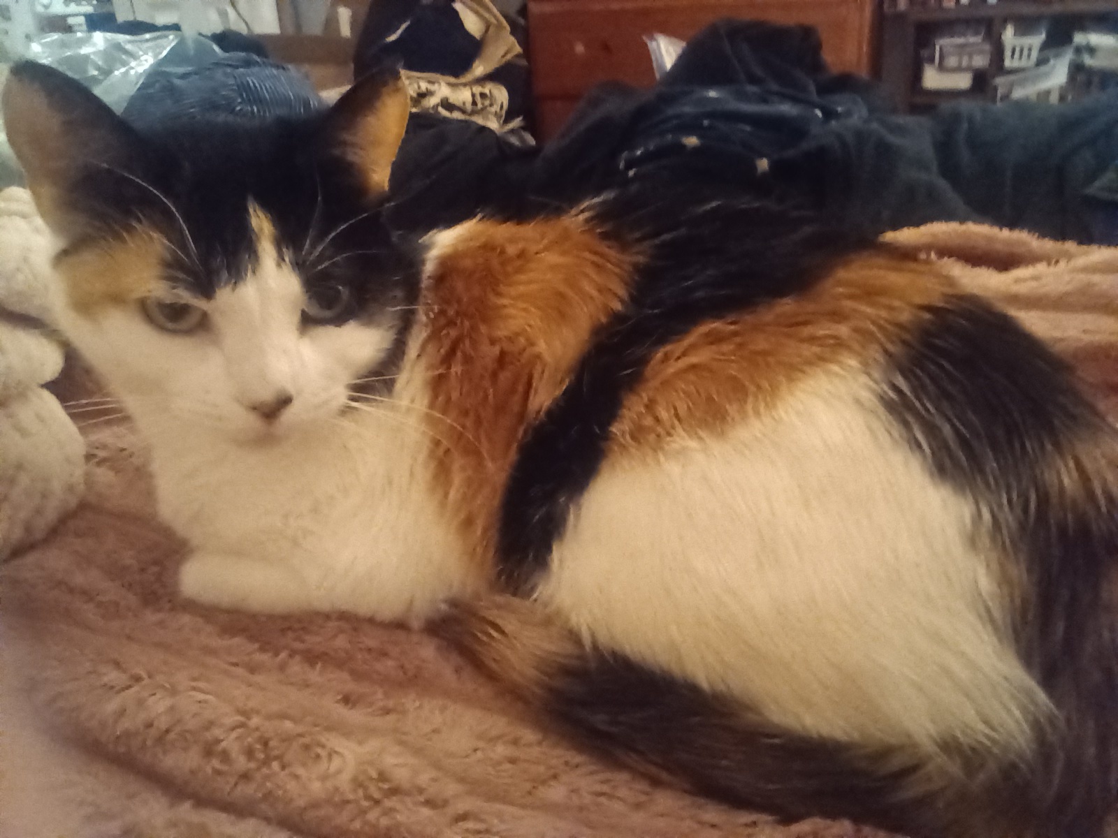 My job, when Mama Anna gets home, is to greet her at the door and lead her to the bed, so she can tell me all about her and Papa’s day, and then we cuddle. Then I get gushy food. I also inspect the bag Mama Anna takes with her for the day. It has lots of pockets, so it is super interesting. She can get a paper book, her tablet/Kindle, and journal stuff. It could theoretically also hold a calico cat, but apparently they do not allow cats into the people vet. Hmph.