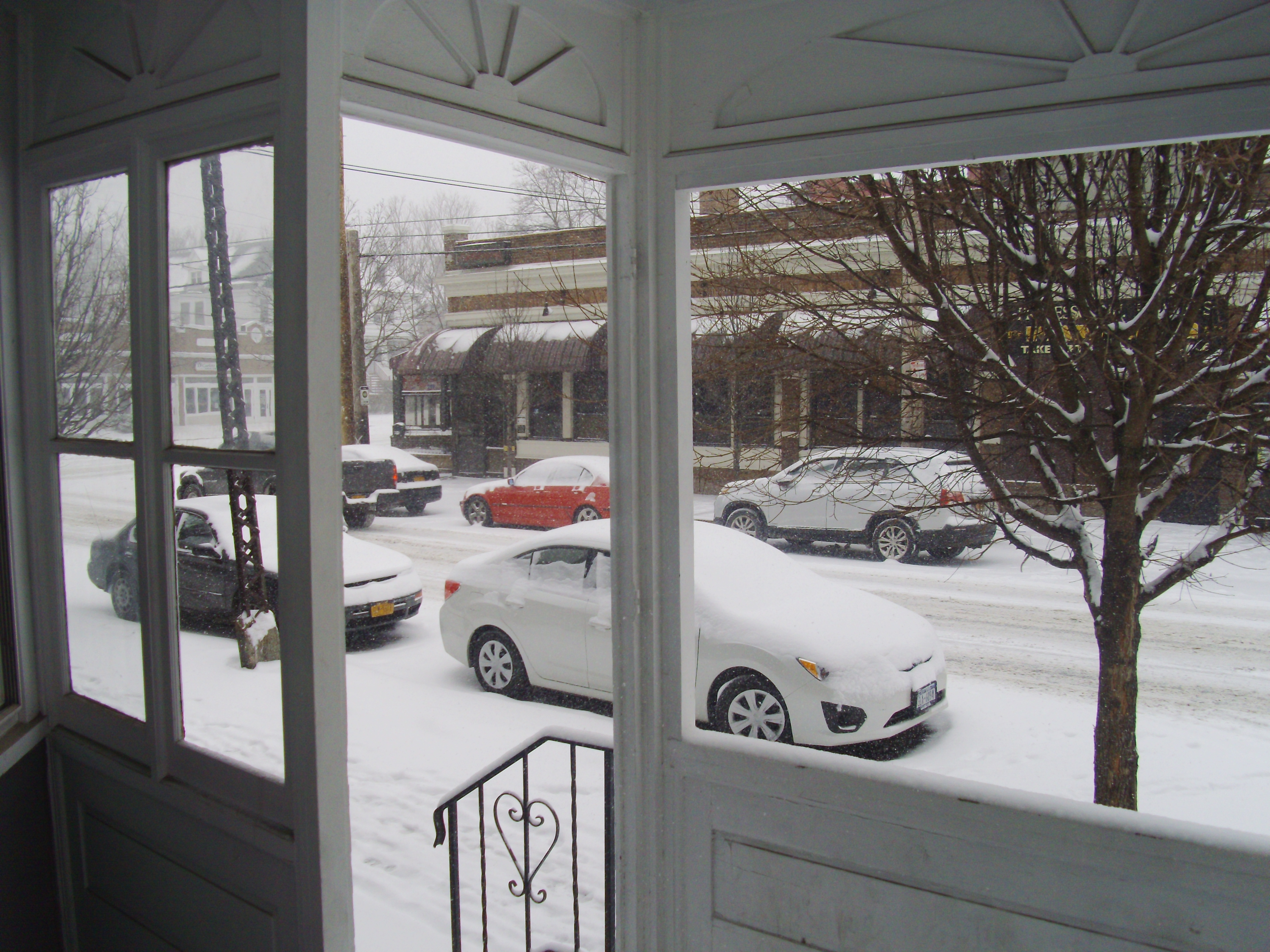 It may also be because she is grumpy over not being able to get out and have fun in the snow. Snow is her favorite weather, and we got it two times this week. One of those times is today, and it is not done yet. She says she is going to go out and take pictures (and get pizza and tea) as soon as she is better, but she did get one picture on the day it was supposed to snow a lot and only snowed some. Since I am an indoor kitty, and the windows are up high, I have to take her word on this, but this is what it looked like outside our house. Is that a lot of snow? I would not know, as I have never been out in it.