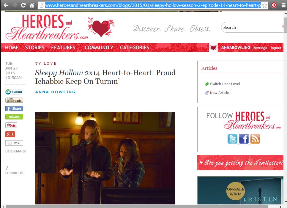 Most of the time, though, she is writing in a notebook or on the glowy box. On Monday, she watched Sleepy Hollow and recapped it for Heroes and Heartbreakers. It is here and looks lie this: