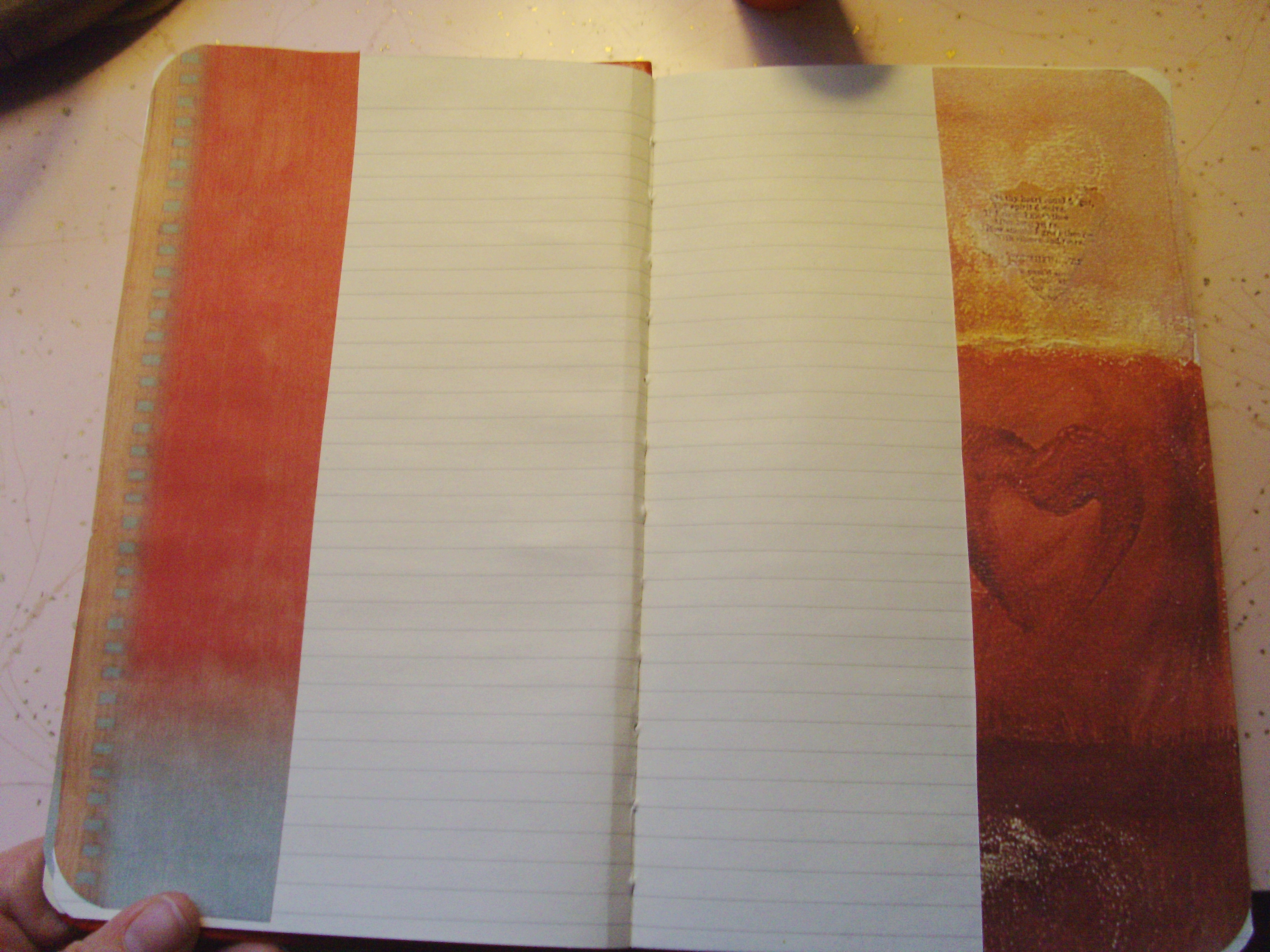 Back inside cover gets the same treatment. There is a pocket beneath the paper with the heart on it. Normally, Anty will put a decorative postcard on the pocket, but with this design, she doesn’t need to do that, as she likes the paper the way it is. If you are wondering what is inside the pocket, it is business cards, stamps and a notecard and envelope. She will probably add other things as time goes on, but that is enough for now.