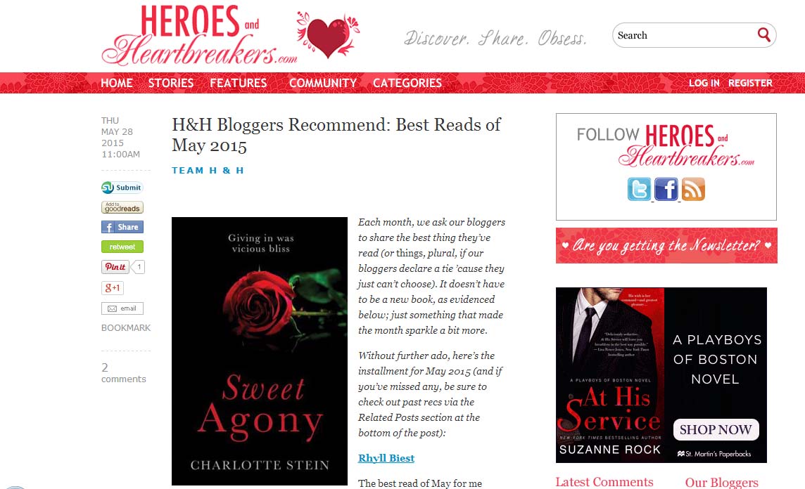 Reading can go a long way toward making Anty un-cranky, so she should do more of that.. Since it is that time of month again, she shared her best read of May over at Heroes and Heartbreakers. A lot of other bloggers shared their favorites, too. Maybe Anty should try some of those books as well, because she still has some un-cranking to do. The post is here and it looks like this: