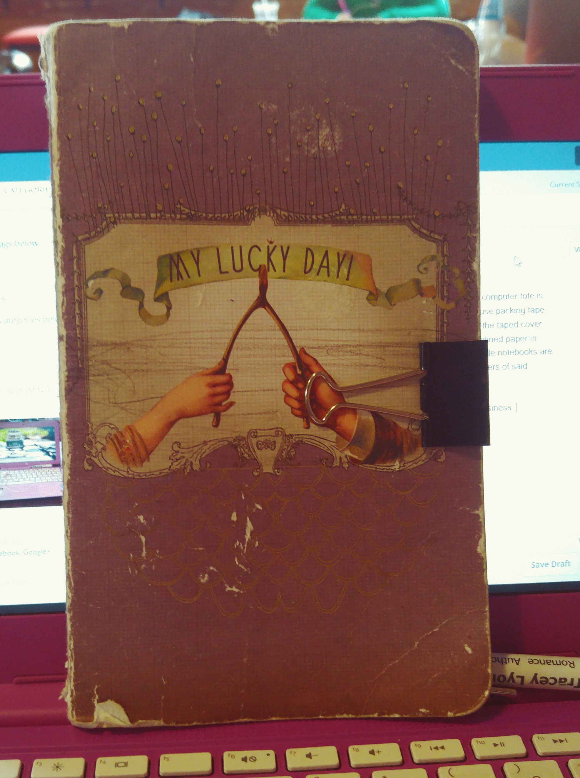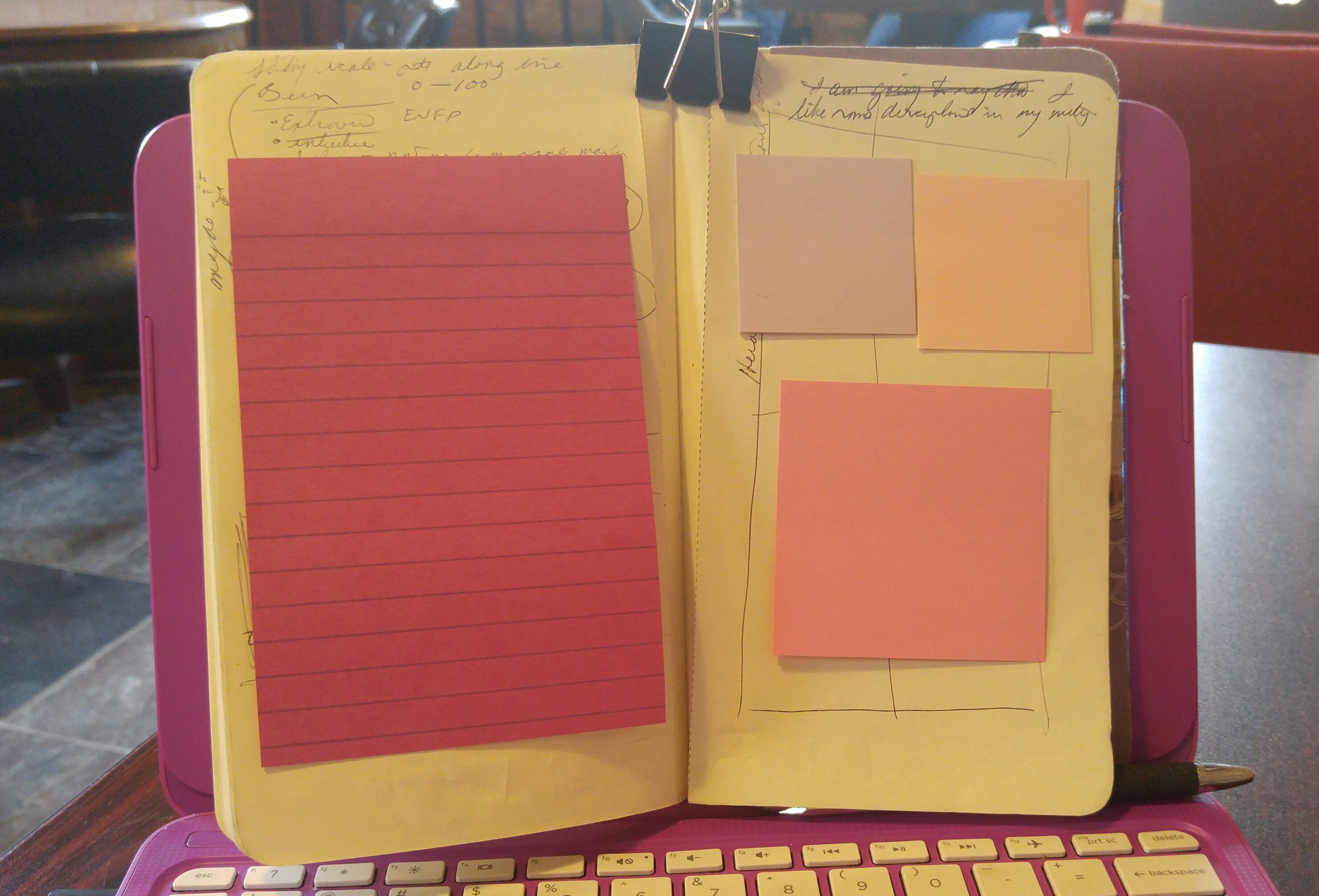 Sticky notes are a must, in any notebook, and yes, they do need to be color coordinated. Artist’s kid here. Color palettes are important. If the colors don’t agree, I feel restless. For a long time, I thought this was being picky, but it’s part of the way I work. If the colors work together, my brain is at peace and I can concentrate. The all purpose pen I have with this notebook is a promo pen, picked up at a conference. It’s clicky, which is good, but it’s also white. White goes with my laptop keys, and the cord from my headphones for the laptop, but I recently rescued a pink promotional pen from an already filled spiral bound notebook, and that needs to be moved over, because pink pen goes with pink laptop, which goes with pinky purply cahier with pinky purply sticky notes inside it. Putting sticky notes directly in the notebook, permanently on a page so that I can get them directly there and not have to fish around in my purse or tote for same, is another game changer. Choosing what stickies go with what notebook helps me bond with the book, as well as makes it easier to employ said notes. I employ a lot of them.