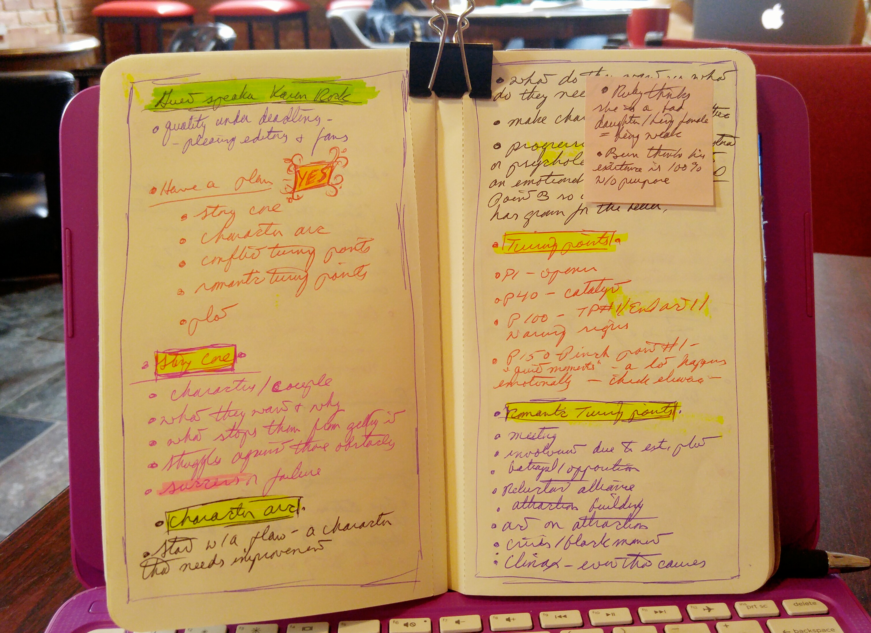 When I’m working on a specific project in a certain notebook, or doing a plot board, my color coding is different. Since I write romance, and character centered romance at that, the characters dictate how I use the notes. I usually will use blue sticky notes for the hero, pink for the heroine, green for supporting characters and yellow for the villain, where there is one (because yellow is my least favorite color.) I’ve seen some writer get fancier with shaped stickies, but I’m a purist with my squares and rectangles. Hm. I could get a whole post out of sticky note use, so thanks for the idea. This may happen soon.
