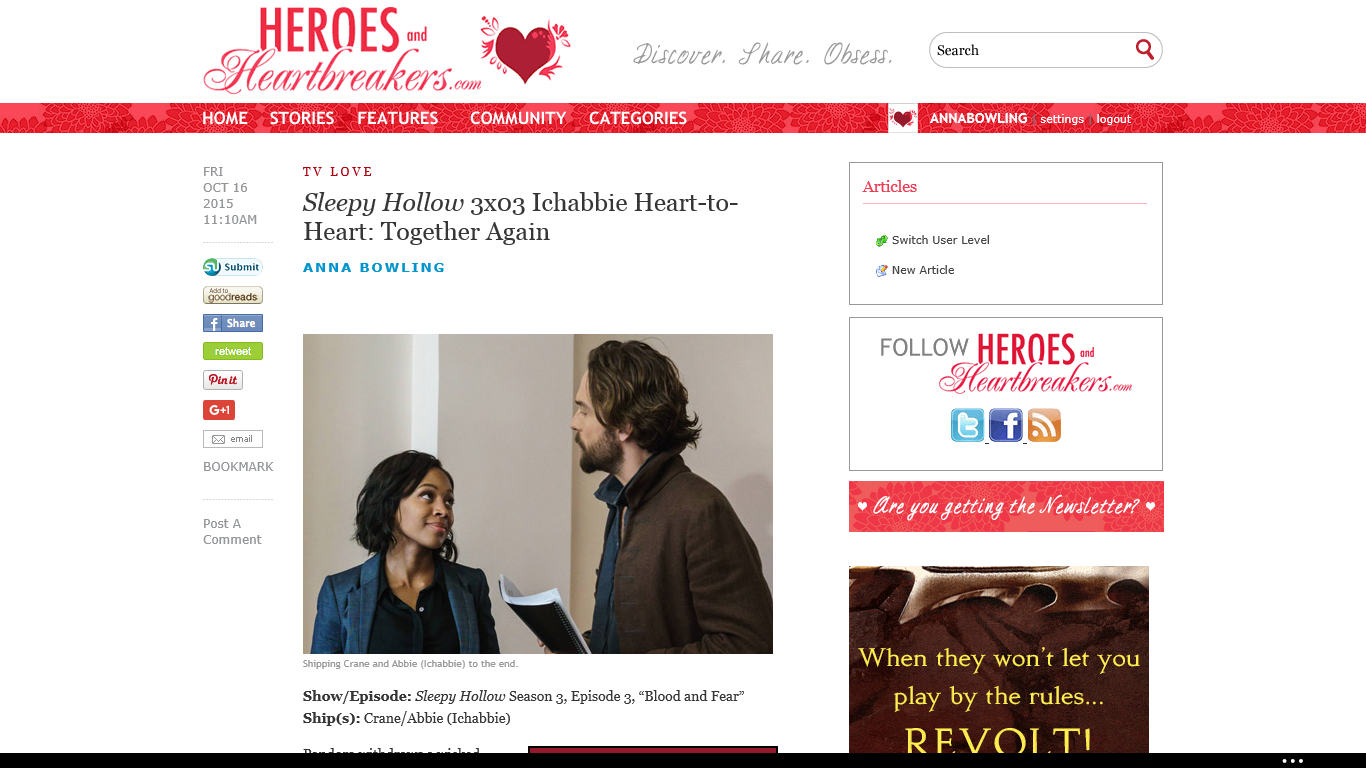 Anty says it is important for creative humans to take in different things that inspire them, so that they will have more tools with which to work. I think she is probably right, because she is reading a lot more now, both older books and newer ones, and all of that is fueling her writing. She has a new Sleepy Hollow recap up at Heroes and Heartbreakers. It is here and looks like this: