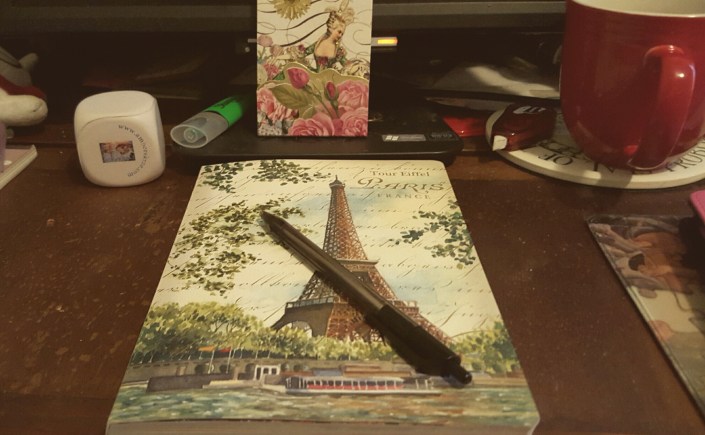 The notebook in today’s picture is from Punch Studio, as is the small notepad propped against the monitor. Yellow sticky notes are plain Post-Its and get tossed as soon as I’ve dealt with whatever is scribbled on them (the note to buy Kentucky mints -the kind with jelly inside- has been there for far longer than I would care to admit. Must deal with that soon.) This notebook is for my version of morning pages; two pages, one sitting, as soon as I can in the day, all by myself, no stopping, no censor. Two pages, rather than three, because a) achievable goals, and b) the interior pages are printed with two-page spreads in four different designs. I’ve been doing this since October 26th, every weekday, and so far, so good.