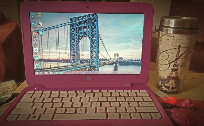 Right now, I am in the comfy chair, bare feet up on the footrest, an ice pack on my lower spine (for heat regulation, not injury; I’m fine.) My Paris travel mug sweats on the table to my right. It’s almost empty. I’ll need to get up and refill it soon. On my left, a box fan sits in the open window. Ominous gray clouds lurk low over the old brick building across the street. There was a wonderful pub there when we moved in; it’s empty now. Its neighbors, a bodega and a liquor store, remain. I am listening to a new-to-me singer, Levi Kreis, on my phone, because Spotify can be patchy when using the web player on my laptop, and I’m still hypervigilant about memory, so downloading very little to the hard drive. I suspect that the multiple YouTube videos H sent me, of the Danish Royal family (it was all for writing, really it was) may have left their ghosts in my cache, because there is a full GB less of space than there was the day before, and I clean caches daily. I’ll deal with that later.