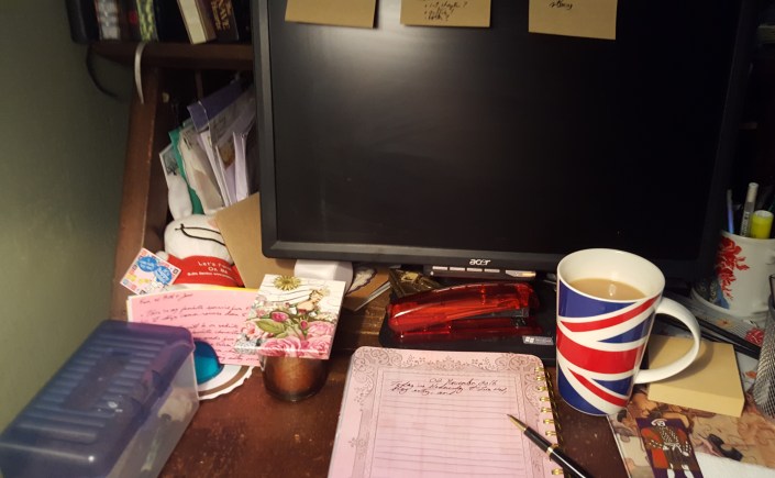 No, I do not mean my desk. Yes, I do know exactly where everything is on it. Yes, there are ways to more efficiently use the space (moving the index card box is one of them; that isn’t where it lives) and I am working on that. Having the big, wide, lovely monitor directy in front of my beloved cubbyholes is not my first choice, but since that is where I can put the old desktop (for now; we will see what happens when the new desktop joins the family) and it’s a small office, one works with what one has.