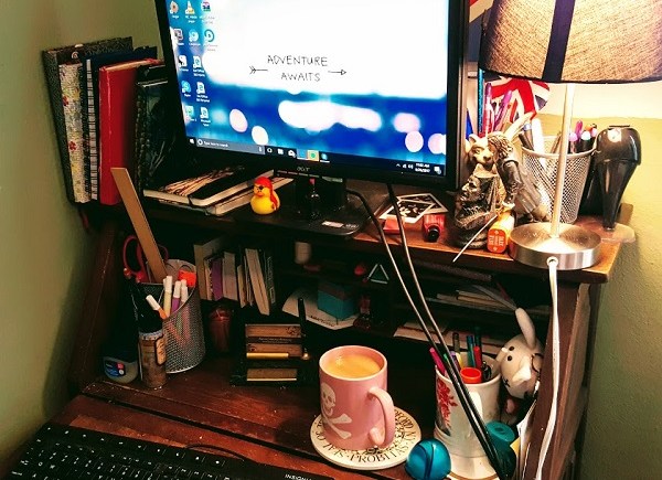 Blogging three times a week, Monday, Wednesday, and Friday (okay, Friday is Skye day, but it’s still a post) here, with Monday and Wednesday always a shot of my desk for the day, is a part of that. Usually, that means I’m working on my desktop, but not always. I do sometimes miss the pink laptop photos, though I may want to figure out why I have to keep the screen at a funky angle if I want to actually see what I’m writing. If I open the laptop at the normal ninety degree angle, the screen goes blank. I have to nudge it forward a bit, and do some adjusting with my lap desk. That’s why my laptop’s travels have been curtailed as of late. Good thing writing can happen anywhere.