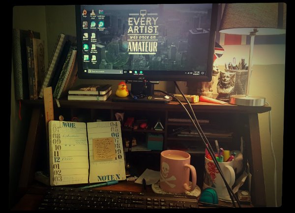 One of theses days, I should probably change my desktop wallpaper. Taking bi-weekly (as in two per week, not one every two weeks; they really are new pictures every time) deskscapes allows me to notice things like that. I like this wallpaper, but it’s been up for a while, and if the whole point of taking deskscapes in the first place is to get a shot of where I am working today, but today looks nearly identical to two days ago, that could arguably be defeating the purpose. I like this wallpaper. I like it a lot; wise words in that image, and it fits my aesthetic. I have my open planner on the desk, so the actual date is clear…if one zooms in…okay, and reads Dutch. Housemate did once ask me, in a worried voice, if the big “woe” at the top of my planner page was my mental state. It was not. I write the days of the week in Dutch. Months, too, but they’re pretty close. We’re almost at October, so maybe Abbie and Ichabod can come back for the season. I may need to start scheduling desktop changes. If it’s in the schedule, I’m more likely to do it.