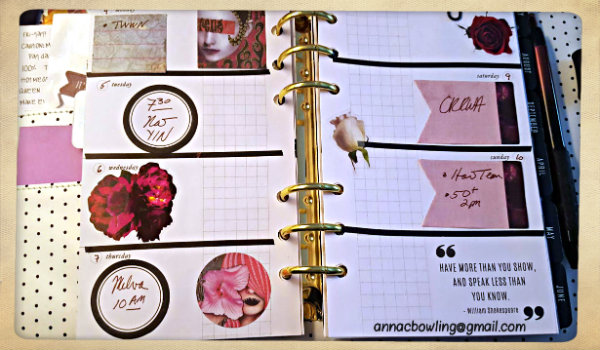 Right now, the picure below is the setup I have for the weekly section of my writing planner. I am fast coming to the end of the stickers that came with the planner kit, which means time to hunt down some more stickers and ephemera that have the same aesthetic. This part of the hunt also serves as some delicious nibbly treats for my idea hamster. Links to or recommendations for Etsy shops, Instagram accounts, etc, where I might find unusual, pretty things for my planners, are greatly appreciated, so drop them in the comments.