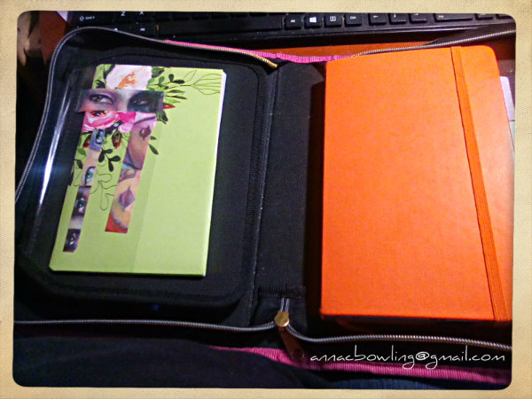 Speaking of orangeness, we now move on to her newly cobbled together blogging notebook. Writer Chick originally got this orange notebook as her daily planner, which was really fun, but took a lot of time, and then she moved, so that kind of fell by the wayside, but she still wanted to use the book, and she can’t countenance getting a new Exceed notebook before she has used the old Exceed notebook. Since she likes writing longhand first in pretty much everything, this book is now her blogging notebook, where she can put down ideas as they come throughout the week, and hopefully cut down on the number of times she stares at the computer screen, makes that “ummmmm” sound, and then babbles until she’s hit 700 words.