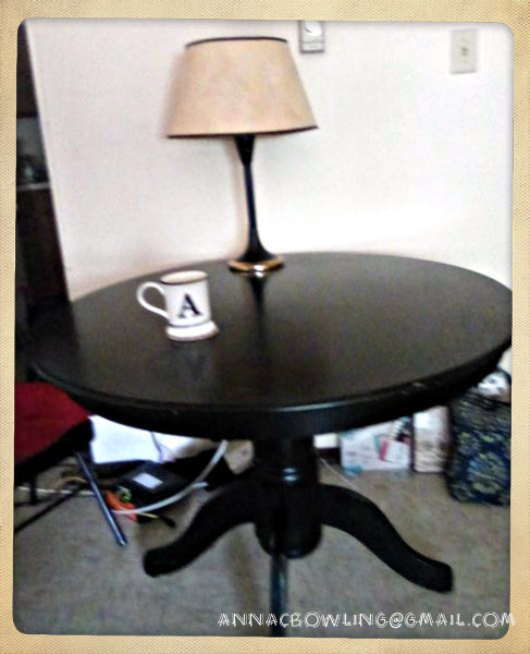 Yesterday, Real Life Romance Hero came home from his morning walk with a table. A big, round, heavy, black wooden dining room table. He did this while I was in the shower. He did not intend to obtain furniture, but, when I shut off the shower, there was the key in the lock sound, followed by the something big is coming through the door sound, and, by the time I had my robe on, and head out the door, there was the love of my life and a huge black dot.