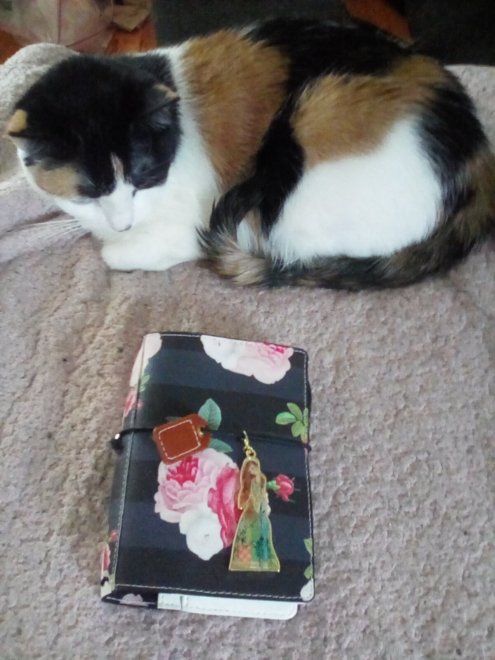 One thing that Aunt Anna has learned is that the best planner or notebook is the one that she actually uses. She has also understood that there will be more paper. Sometimes, the best way to find out what sort of notebook a cover wants to be is to set it up and then see what transpires. Since Aunt Anna still needs to print out her reading tracker stuff, and she has other covers that are that size, and she just got the color and pattern of filler paper from Yellow Paper House that she has been drooling over for literally years (since Skye was the kitty here; that’s longer than I have been alive) this provides some useful direction. She took everything out and put in only the new paper, then started adding other things, like this.