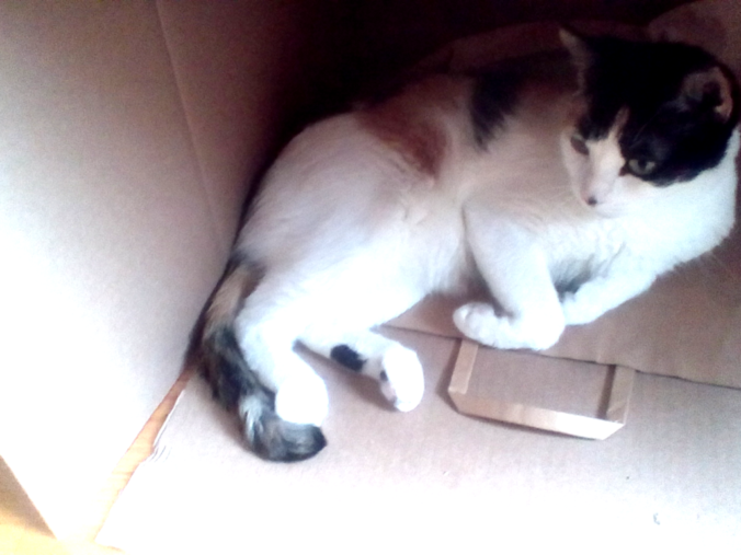 First of all, take a look at my sweet summer digs. I have my footlocker box, with a paper bag inside it. That’s pretty luxe from cat standards. I get a nice breeze from the bos fan, I can see both Aunt Anna and Uncle Rheuben from there, and of course I can see my dishes from here, too, in case anything is happening there.