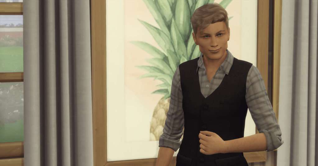 I had snapped a shot of the current setup with the lights and all, but Amazon Photos is not cooperating, so here is Michael, one of my current Sims, who was on the screen when I took the photo