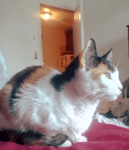 Zoom: I am fast. I am very, very fast. The humans call me The Calico Comet, because when I get on a rip, I am extremely zoomy. When we were on that awesome year-long camping trip to celebrate my adoption, we sometimes stayed in motels. Those rooms had two beds in them and I loved running super fast, sproinging up on one bed, then sproinging across the space between them and back again. That was Super Fun. There are two beds in our apartment, but they are in different rooms, so when I sproing, I do it on Papa and Mama Anna’s bed, then zoom around the kitchen or in Aunt Linda’s room, then I come back and sproing onto the bed again then run off again.