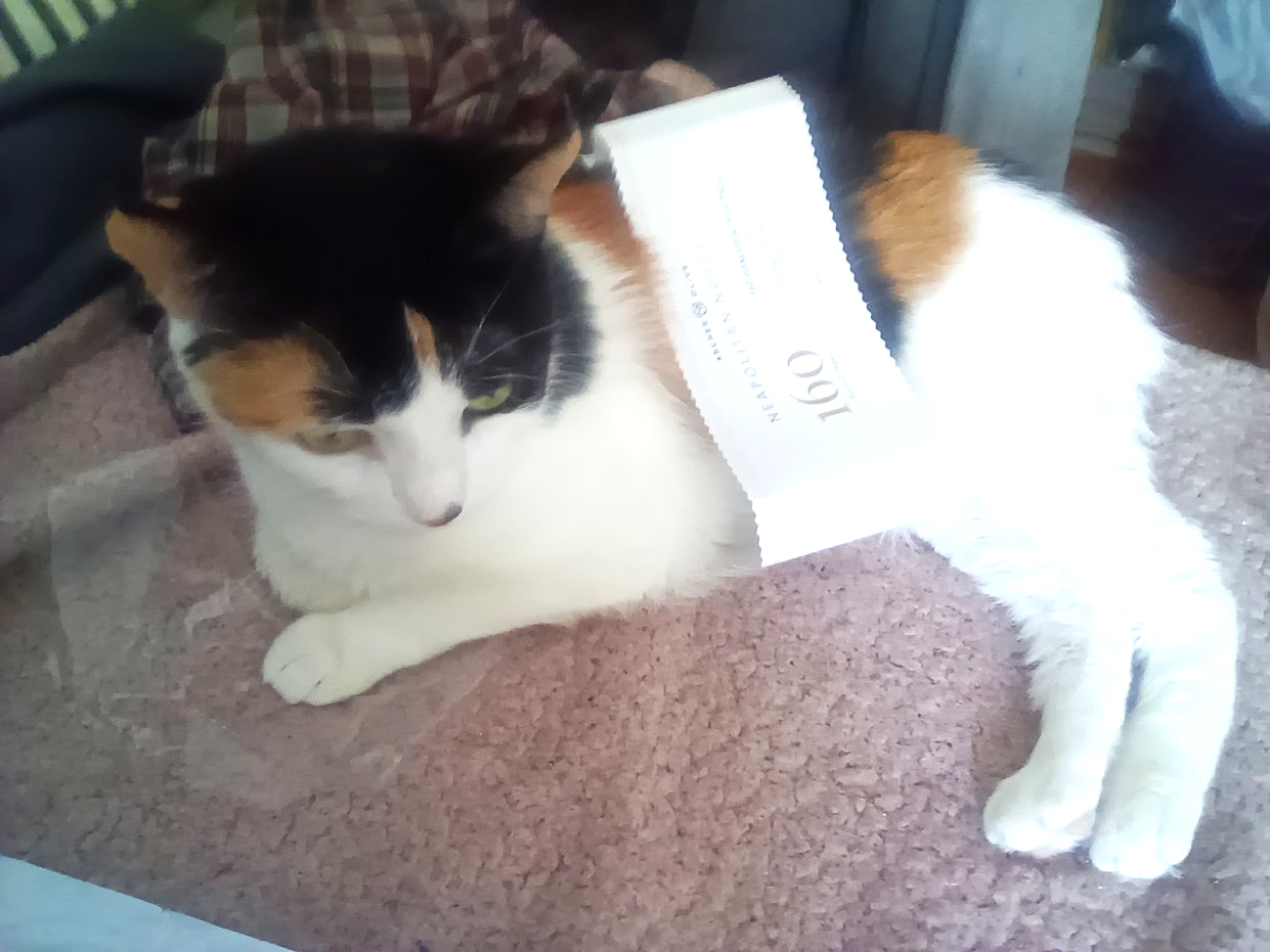 Since human eyes are not as awesome as cat eyes in seeing detail, I should tell you that the print on the belly band in the picture above is from Mama Anna’s new “Neapolitan” Archer and Olive n notebook, but we properly refer to it by its right name, Calico. It has black pages, white pages, and kraft pages, which is close enough to orange. She says it is in honor of me. I appreciate the recognition. Mama Anna thinks she will probably use that as her first bullet journal of 2024.
