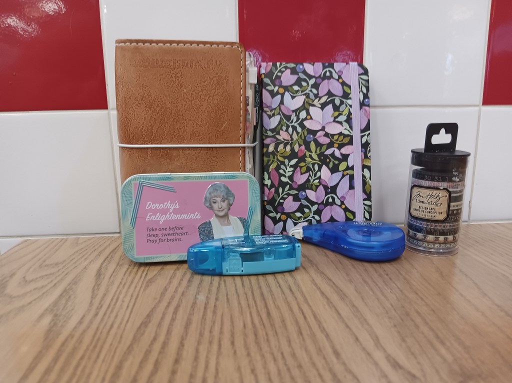Skinny washi tapes are from Tim Holtz. The two blue items are a correction tape runner and adhesive runner, and the tin with my favorite Golden Girl (Dorothy Zbornak is an integral part of my final form) holds ephemera, including tea tags, stickers, washi samples and miscellaneous things that catch my fancy. There is also a growing collection of enamel and pinback pins, not pictured, as I am still moving them around.