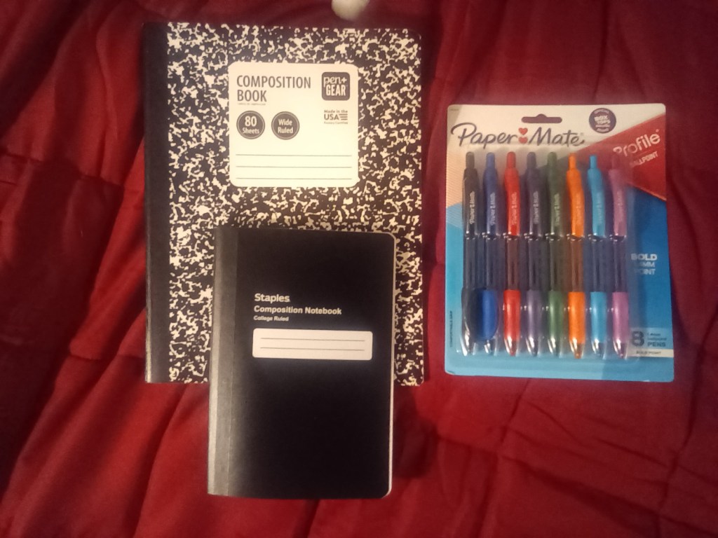 I have also found that there are more sizes than the standard (B5) composition size. The Staples notebook, above (black) is a B6 size, about the same as a Happy Planner Mini. I normally prefer gel or fountain pens, but for composition book paper, ballpoints are working well. I have seen the Pen + Gear notebook above used with fountain pens before, so I will probably try that.
