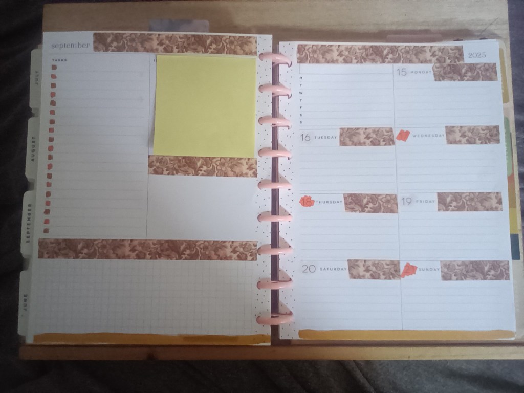 After I post this blog today, I get to spend the rest of the afternoon putting away spring and summer planner/journal things and getting out the fall team. There is indeed a separate winter team, which comes out the day after Thanksgiving. Right now, I am all browns and yellows and reds and oranges, in anticipation of the foliage soon to come. Here’s a peek at my writing planner, before the pen: