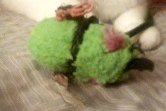 Since the pink elastic I had for her closure had stretched out, and my only options for replacement (on hand) were turquoise and purple, I figured this would be a great time to dive in and make her a pastel Christmas themed sort of thing. Second thought was to make her gothy. Couldn’t decide, so now she’s both.