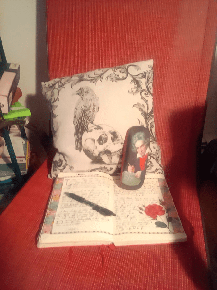 It may have taken me until now, but I finally have a reading nook in our bedroom. One very comfy patio chair, one suitably spooky elegant pillow, a comfy throw (not pictured) and I’m home. Of course, obviously, I am home, as in this is the place where I and my family live, but this nook is only for me. Okay, me and Storm. Beethoven glasses case is a gift from Real Life Romance Hero, and journal is an A5 Exceed lined journal. Right now if I could only have one journal, that’s the one I would pick (100 gsm; there is also 78 gsm, but I always want the higher count.) Embellishments (washi and floral sticker) from my stash cobbled from various sources. Current pen is a Zebra Sarasa.07, but I’m not picky about what black gel pen I’m using. I like Pilot G2 and Paper Mate Inkjoy as well.