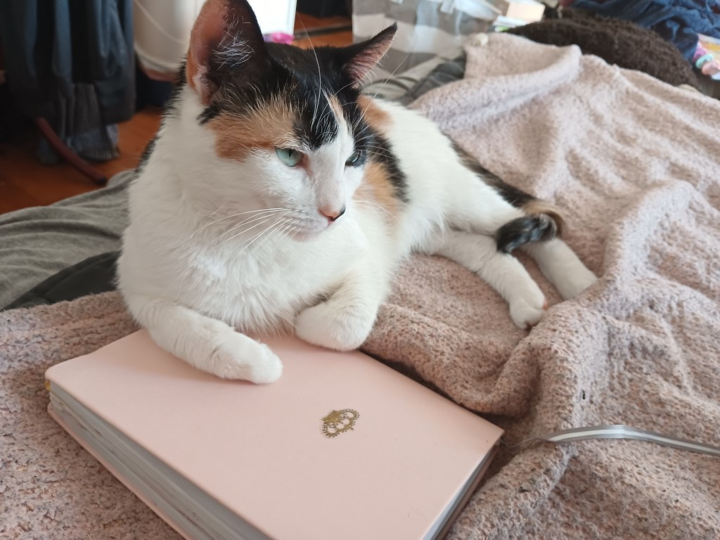 Will I try to steal her pens that she writes with in that? Yes. Will I sit on the open pages and the closed cover? Yes. Is she fully aware that if the notebook has a leather or faux leather cover, that I will do the pricky-pricky-pricky things with my murder mittens to the cover? Yes. Might she try to foil me by putting a cover over that cover? Almost certainly. Will that stop either one of us? Probably not, but there is only one way to find out.