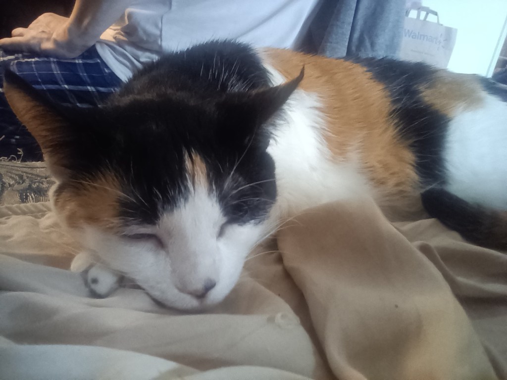 Storm is definitely doing her job. When I get home from the hospital, she meets me at the door. She leads me into the bedroom, and insists I lie on the bed, so she can jump on me, loaf, and purr. I pet her. She is warm and soft. She insists that Housemate and I give her gushy food when we have our dinner. She has a new tilted food dish that is only for gushy food. She deserves all the treats and many belly rubs.