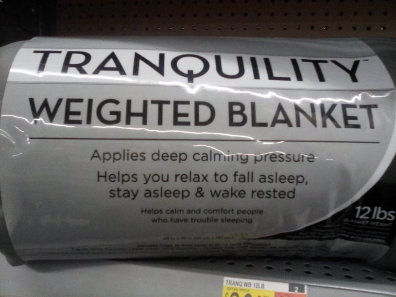 For those who wanted to know what blanket she got, it is the Tranquility blanket from Wal-Mart, the twelve pound version. She thinks it is the twin size, even though her and Uncle Rheuben’s bed is either double or queen (they aren’t sure.) Uncle Rheuben doesn’t need the weighted blanket, so it goes on Aunt Anna’s (and my) side only.