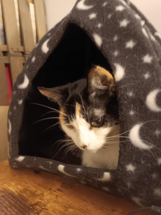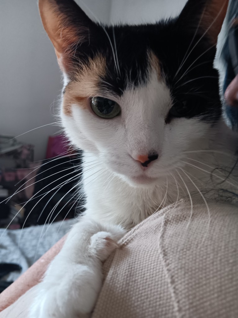 Kitty fit check. If you were wondering if I would let Mama Anna put clothes on me, the answer is yes, but ONLY Mama Anna, and we have only done hats and scarves so far. We may try dresses later, but I am already gorgeous au naturel. Mama Anna did once see a video of a calico cat wearing a clear raincoat walking through rainy Tokyo, which cemented for her that if I ever need a raincoat, it will be clear. I probably won’t need a raincoat. I am an indoor cat.