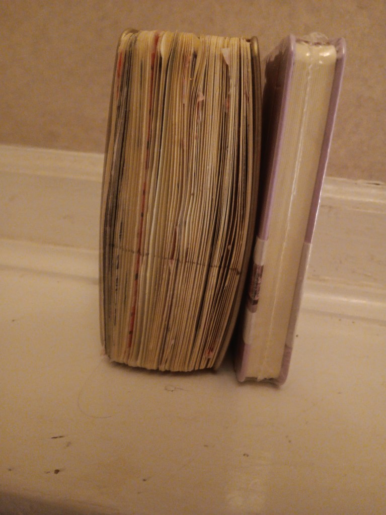 Change of season also means change of Mama Anna’s nighttime journal. The big chonky journal is the old one she just finished, and the thin one, still in its shrink wrap, is the new one. They are about pocket size and last about three months. The old one is metallic gold and the new one is lavender. Mama Anna thought that was good for summer. The other options were black and navy blue. She is saving those for fall and winter and then needs to restock. The art store near Aunt Mary sells them, so she will probably get some when she visits there. The art store in our city has them sometimes.