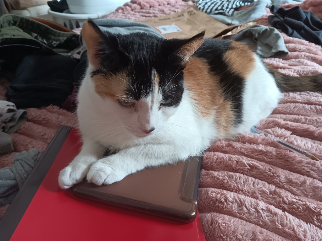 This is me on top of Mama Anna’s Kindle and one of her composition notebooks. I love this time of year, because Mama Anna gets super happy about school and office supplies going on sale. I, of course, have to inspect all new arrivals and make sure they smell right. That means like us. In about a week, we will be moving into the end of July and then it will be August, which is Papa’s Birthday season, and also shifts, at least for Mama Anna, from summer to pre-fall, and pre-fall is Super Powers Prep Time.