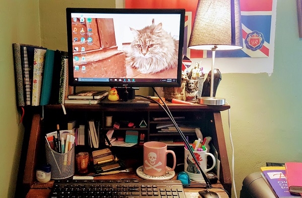Greetings, Foolish Mortals. Sebastian Thunderpaws Hart-Bowling, coming at you with all the stuff from the week that was. I’m hanging out today with my buddy, Stripey Guy. I am also stripey, and also a guy, but you know me and names. Anyway, the title of this week’s blog entry should tell you the big thing around here. Writer Chick is still not at RWA Nationals, and she is still kind of salty about it. I am attempting to ramp that down a little by recreating some of the atmosphere. Mainly that I block her way to the bathroom, but she does seem to like it when anonymous entities put books on her chairs.