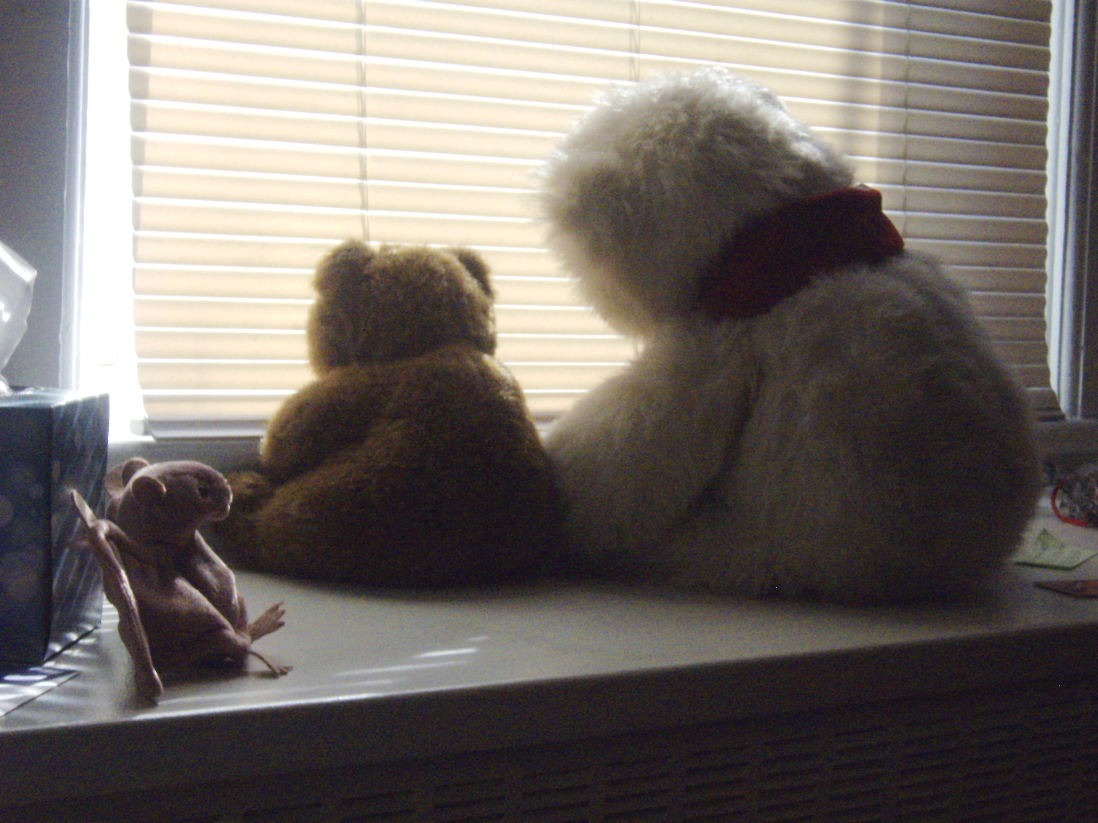 There is only one problem with that. If the sneezy flowers are in the office, she can’t be, and she needs to rearrange the office because a new destktop computer is coming home in a couple of weeks (it is not new-new but it is new to Anty, so that still counts.) This means the flowers have to go, but where? At first, Uncle had a good suggestion. Anty could bring them to a friend who had to stay at the people vet for a while. Anty agreed that was a good idea, and she took the sneezy flowers all the way to the people vet, only to find that their friend’s room was…empty. A nice nurse assured Anty everything was okay and that the people vet said their friend was better and had gone home only a few minutes before. Anty took the sneezy flowers back home and told Uncle they had to think of another place.
